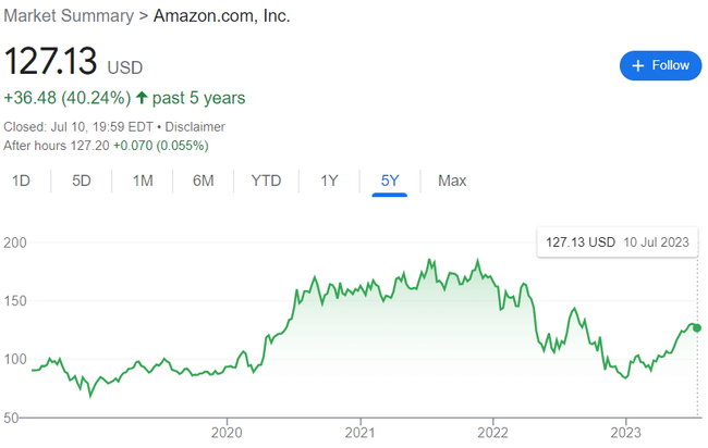 Pohyb akcií firmy Amazon za posledných päť rokov. (Zdroj: Google Finance) *