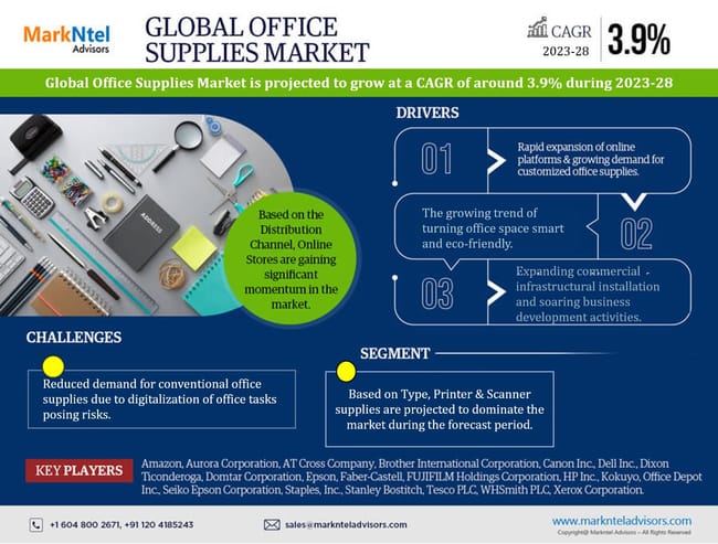 The latest research report by MarkNtel Advisors, titled Global Office Supplies Market, offers a comprehensive industry overview and market perspective. This study provides an extensive examination of the current market landscape, encompassing market trends and the latest global advancements. The report delves into an in-depth analysis of market size, market share, industry trends, forecasts, and the competitive environment, presenting a clear and informative portrayal of the market, supported by relevant statistical data.