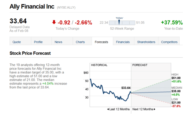 The 19 analysts offering 12-month price forecasts for Ally Financial have a median target of 35.00, with a high estimate of 51.00 and a low estimate of 21.00.