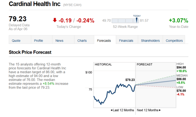 The 15 analysts offering 12-month price forecasts for Cardinal Health Inc have a median target of 86.00, with a high estimate of 94.00 and a low estimate of 76.00. The median estimate represents an increase of +8.54% from the last price of 79.23.